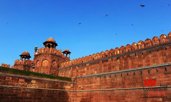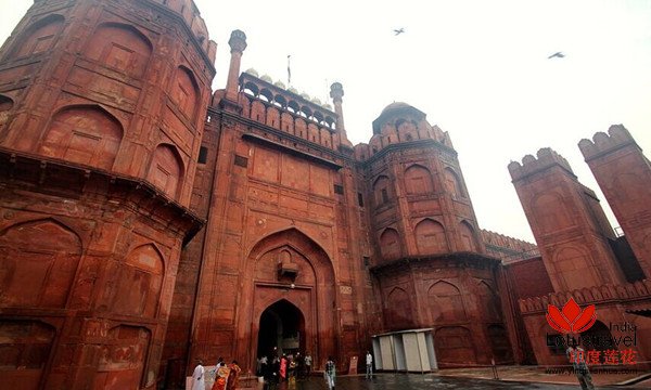 德里红堡(Red Fort)是印度享誉世界的古老伊斯兰文化建筑名胜,坐落在德里旧城东北部、亚穆纳河西岸。传闻它是莫卧儿王朝第五代国王沙杰汗因爱妻泰姬玛哈逝世,在故都(阿格拉)处触景伤情而迁都德里后,仿照著名的阿格拉堡设计建造的。